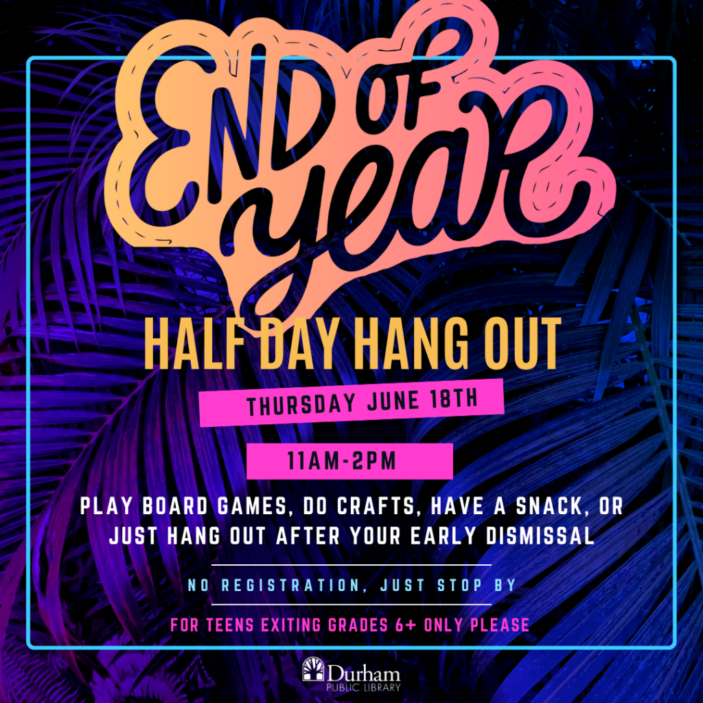 Stop by the teen department for games, art projects and snacks to celebrate your last week of school!