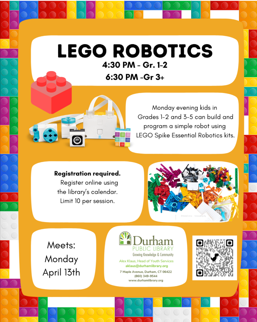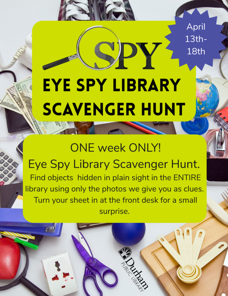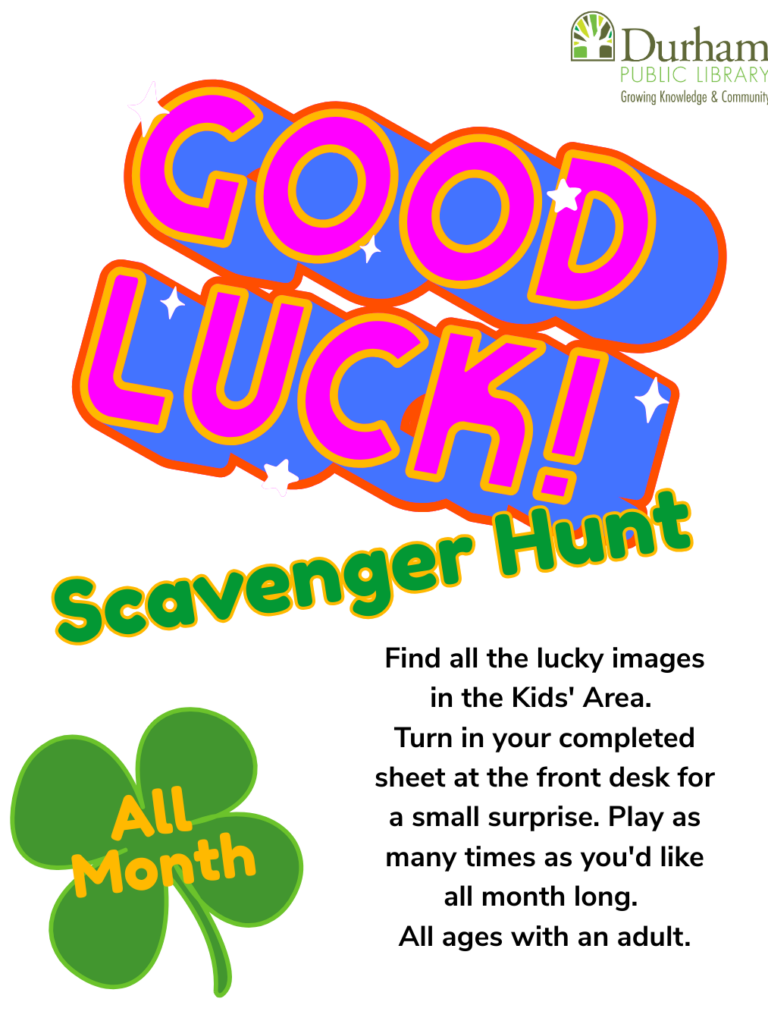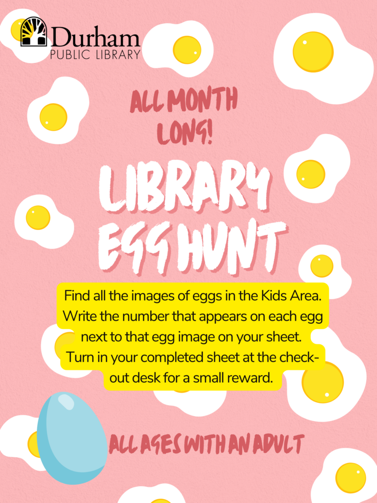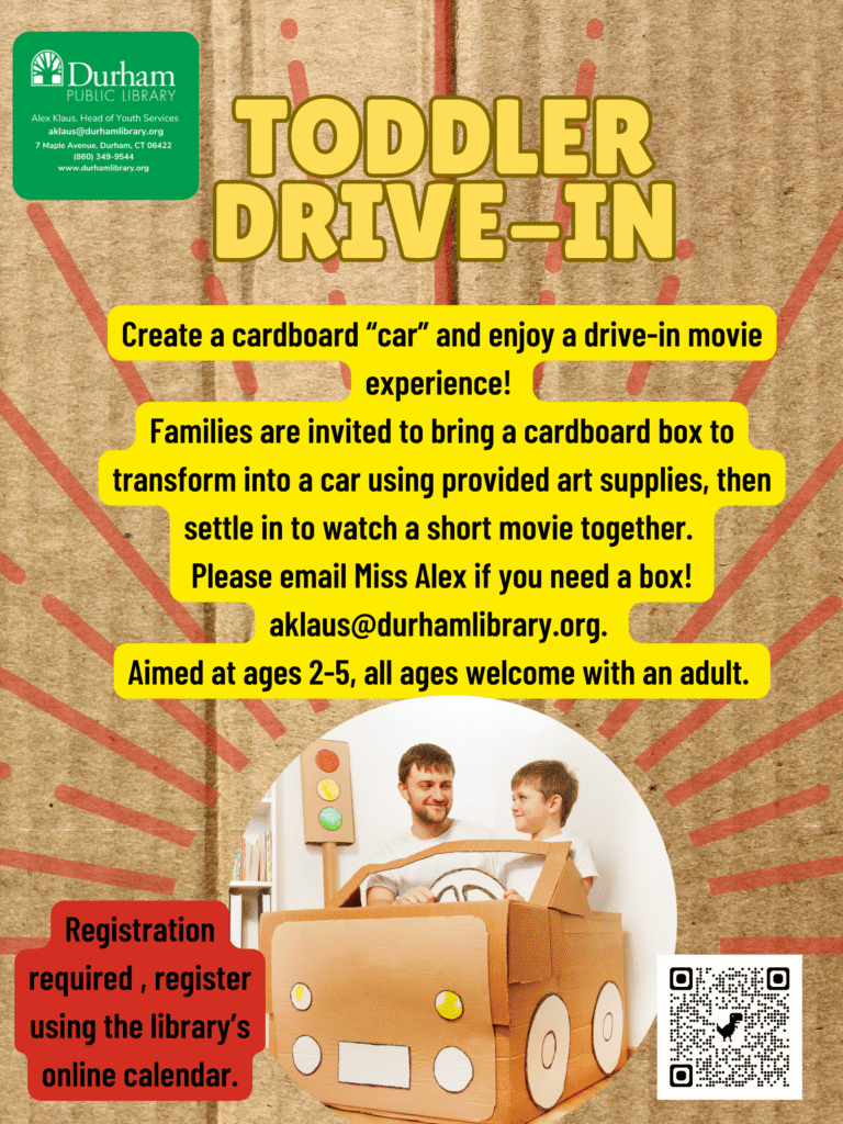 Create a cardboard “car” and enjoy a drive-in movie experience! Families are invited to bring a cardboard box to transform into a car using provided art supplies, then settle in to watch a short movie together. Please email Miss Alex if you need a box! aklaus@durhamlibrary.org. Aimed at ages 2-5, all ages welcome with an adult.