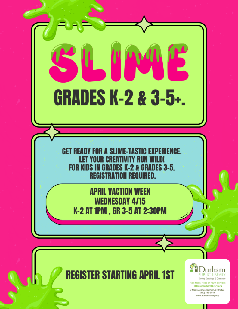 Paper: Drop off at the front desk or mail to Durham Public Library, Attn: Youth Services Dept., 7 Maple Ave., Durham, CT 06457.