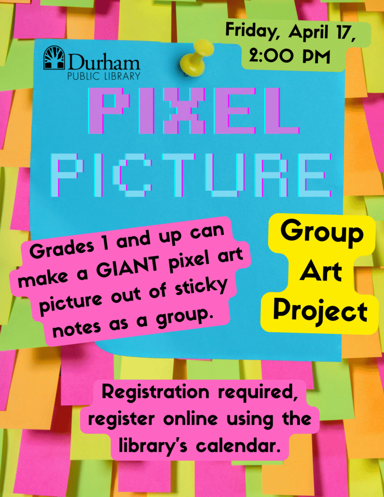 Grades 1 and up can make a GIANT pixel art picture out of sticky notes as a group. Registration is required. There are 12 seats available.