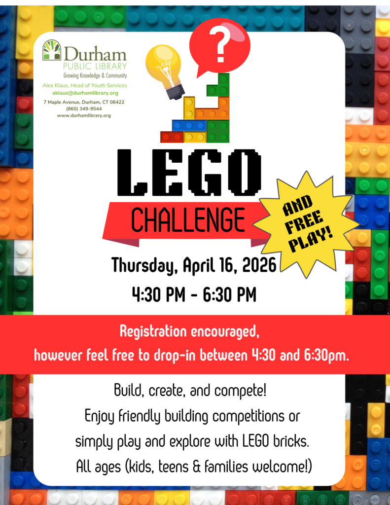 Build, create, and compete! Join us for a LEGO Challenge & Free Play event. Enjoy friendly building competitions or simply play and explore with LEGO bricks. All ages (kids, teens & families welcome!)